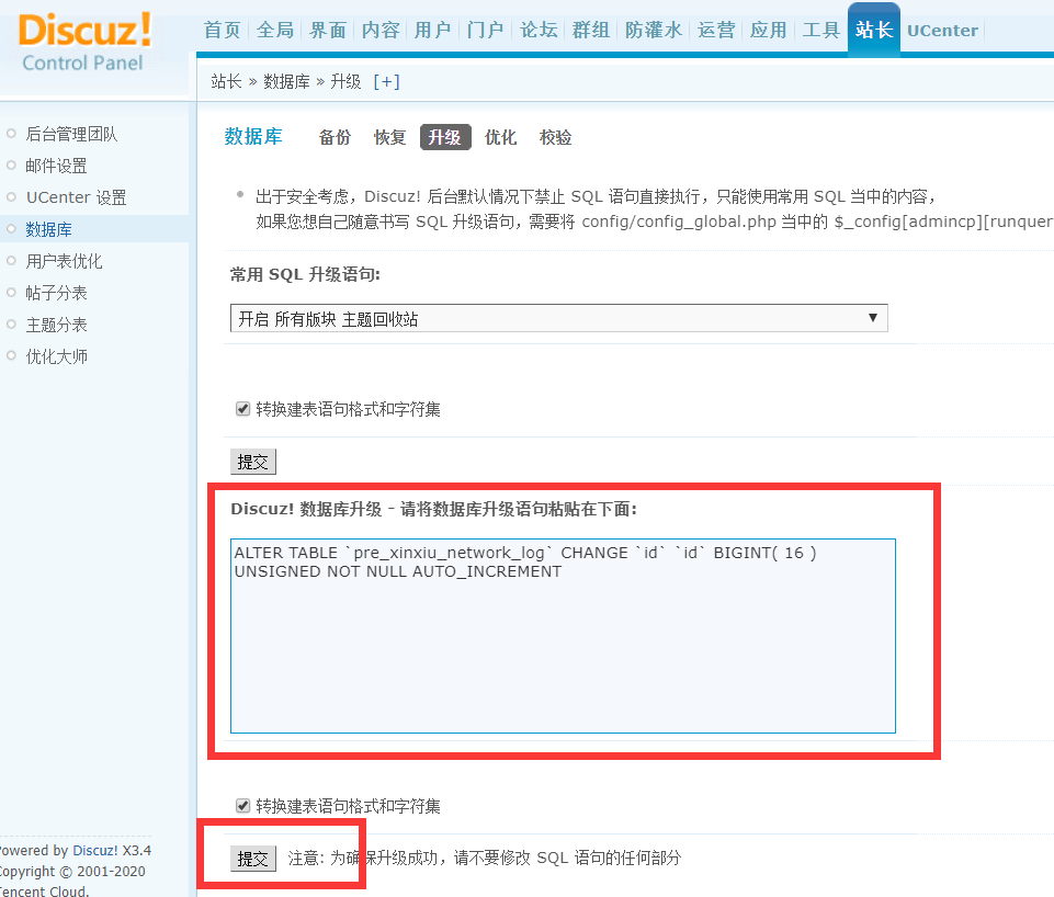 修復(fù)5.5版本,后臺接口日志65535報(bào)錯問題,后臺SQL升級即可。(注意表前綴pre_,如果不是默認(rèn)的,自行修改)