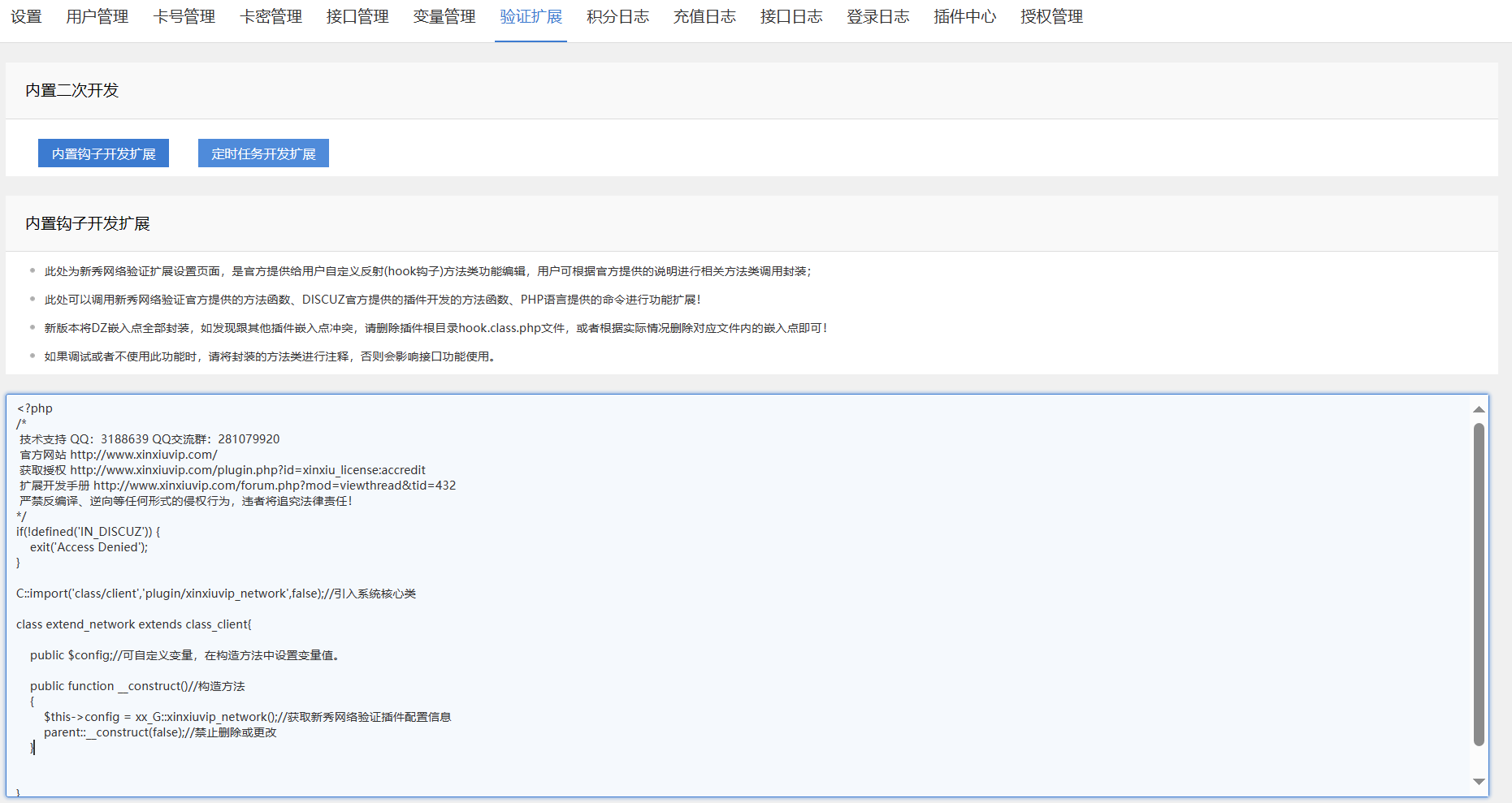 正文摘要:驗證擴展二次開發本擴展由PHP+MYSQL語言開發,通過內嵌在新秀網絡驗證系統HOOK鉤子,在正常API接口執行時自動調用,不需要擴展時無需設置。1、驗證擴展是結合新秀網絡驗證系統進行的二次開發,不能獨立使用;2、驗證 ... |