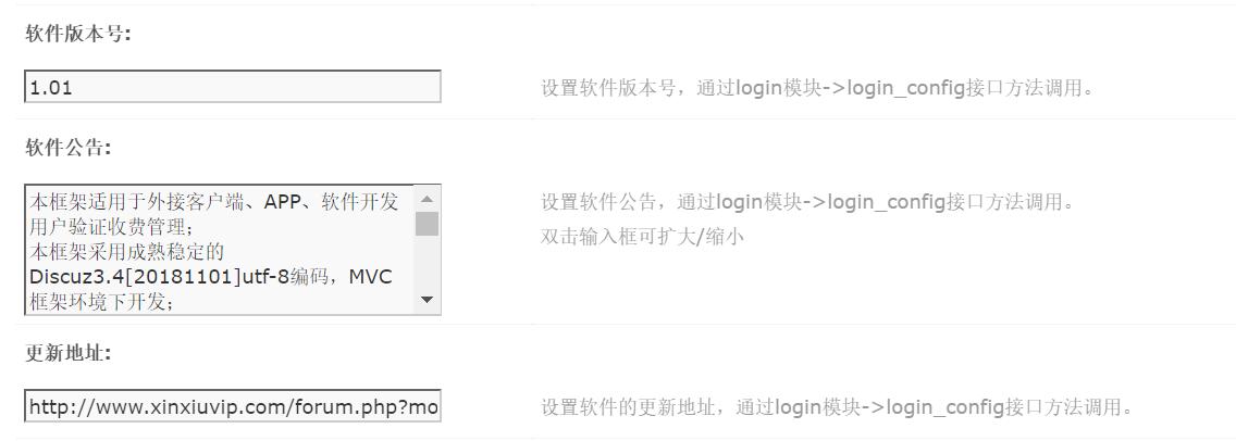 正文摘要:后臺提供客戶端軟件配置信息,在開發客戶端軟件時,提前調取版本號,判斷是否需要更新。 接口信息接口名稱:獲取軟件配置信息接口路徑:http://demo.xinxiuvip.com/plugin.php?id=xinxiu_network:login&key=123456 ... |
